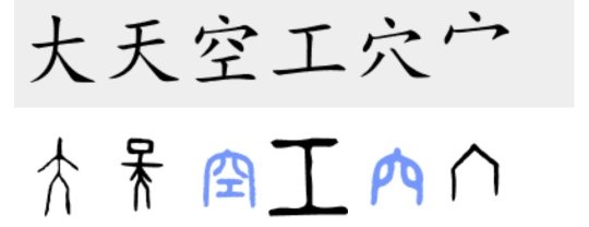 If you know Chinese character, you know each character or its component is a picture. The character 天 is 一大。大 is picture of a man,空 could be 穴工。